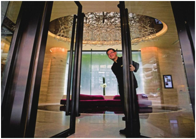 當(dāng)客人到達(dá)酒店時,他們首先看到的是酒店的入口,這會給客人留下第一印象。對于酒店來說,入口不僅是進(jìn)出的通道,也是室內(nèi)和室外的過渡空間。入口包括門、門洞、臺階、引道、入口廣場和該范圍內(nèi)的其他因素(如鋪地、綠化、欄桿、水景、雕塑、停車場等)。